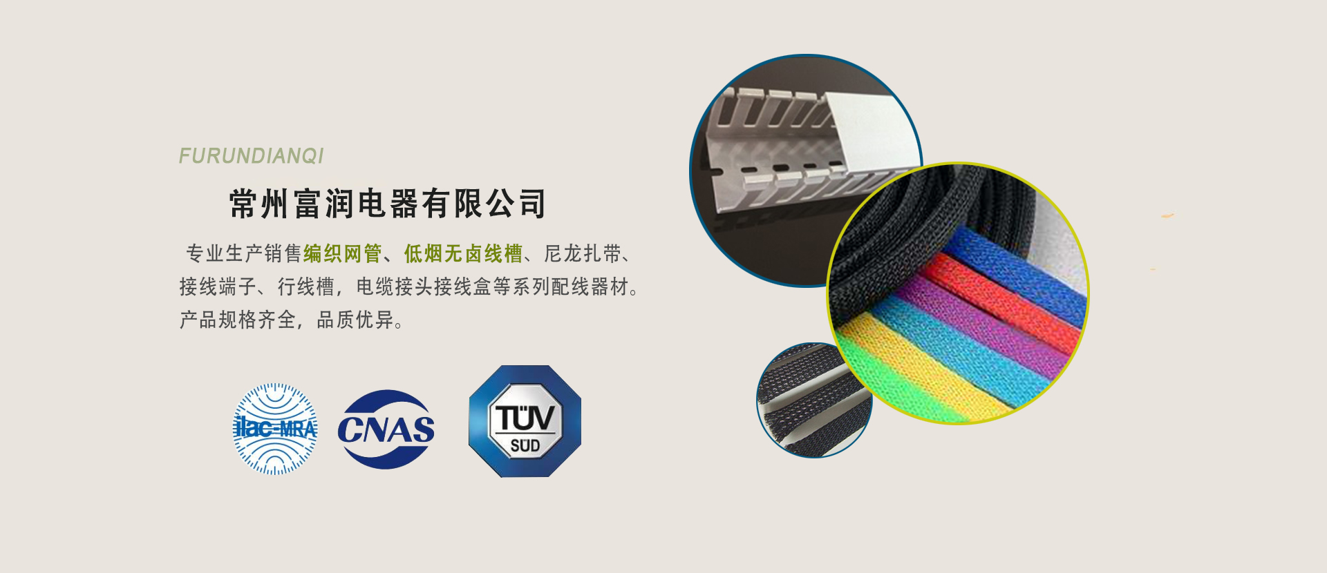 常州富潤(rùn)電器有限公司專(zhuān)業(yè)生產(chǎn)、銷(xiāo)售編織網(wǎng)管、尼龍?jiān)鷰А⒔泳€端子、行線槽,電纜接頭接線盒等系列配線器材···